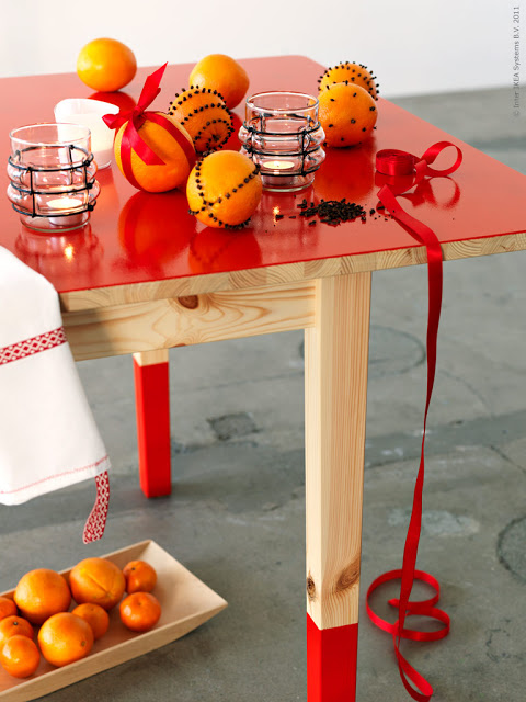 Quer usar frutas na decoração da sua mesa de Natal? Então pegue essa ideia da Ikea Livet Hemma, use laranjas enlaçadas em fita vermelha e outras salpicadas de cravos. Além do delicioso aroma, sua mesa vai ficar iluminada com as cores vermelho e laranja.