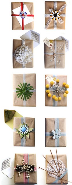 Quando eu tinha uns 5 ou 6 anos meu sonho era ser empacotadora de loja. Adorava acompanhar minha mãe às compras só para prestigiar as moças que faziam aqueles pacotes lindos, com dobraduras, fitas e etiquetas. Hoje, toda vez que preciso fazer um pacote lembro daquela época. Aliás, prefiro sempre embrulhar os presentes em casa ao invés de optar pelas embalagens prontas e padronizadas das lojas. Acho que fica mais pessoal e ainda posso personalizar o embrulho. Ao longo do ano vou juntando fitas, papéis, tecidos, caixinhas, recortes e tudo mais que considerar legal para ornamentar um pacote. É uma delícia! Experimente e inspire-se nos pacotes abaixo.