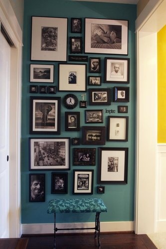 Em regra geral, você deve colocar o quadro ao nível dos olhos, ou seja, cerca de 1m65cm a 1m72cm acima do chão. Se o teto for muito alto, pode jogar com as regras e o espaço, pendurando os quadros ligeiramente mais altos. O tamanho da parede também deve ser considerado. Por exemplo, numa parede grande, quadros pequenos ficam melhor quando agrupados. No caso da criação de uma parede inteiramente composta por fotografias, ficará muito mais interessante utilizar molduras de tamanhos diferentes e as mesmas distâncias entre os quadros, de 6 a 10 cm.